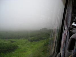 8:05 畳平バスターミナルに到着。BTはガスの中。霧雨状態。